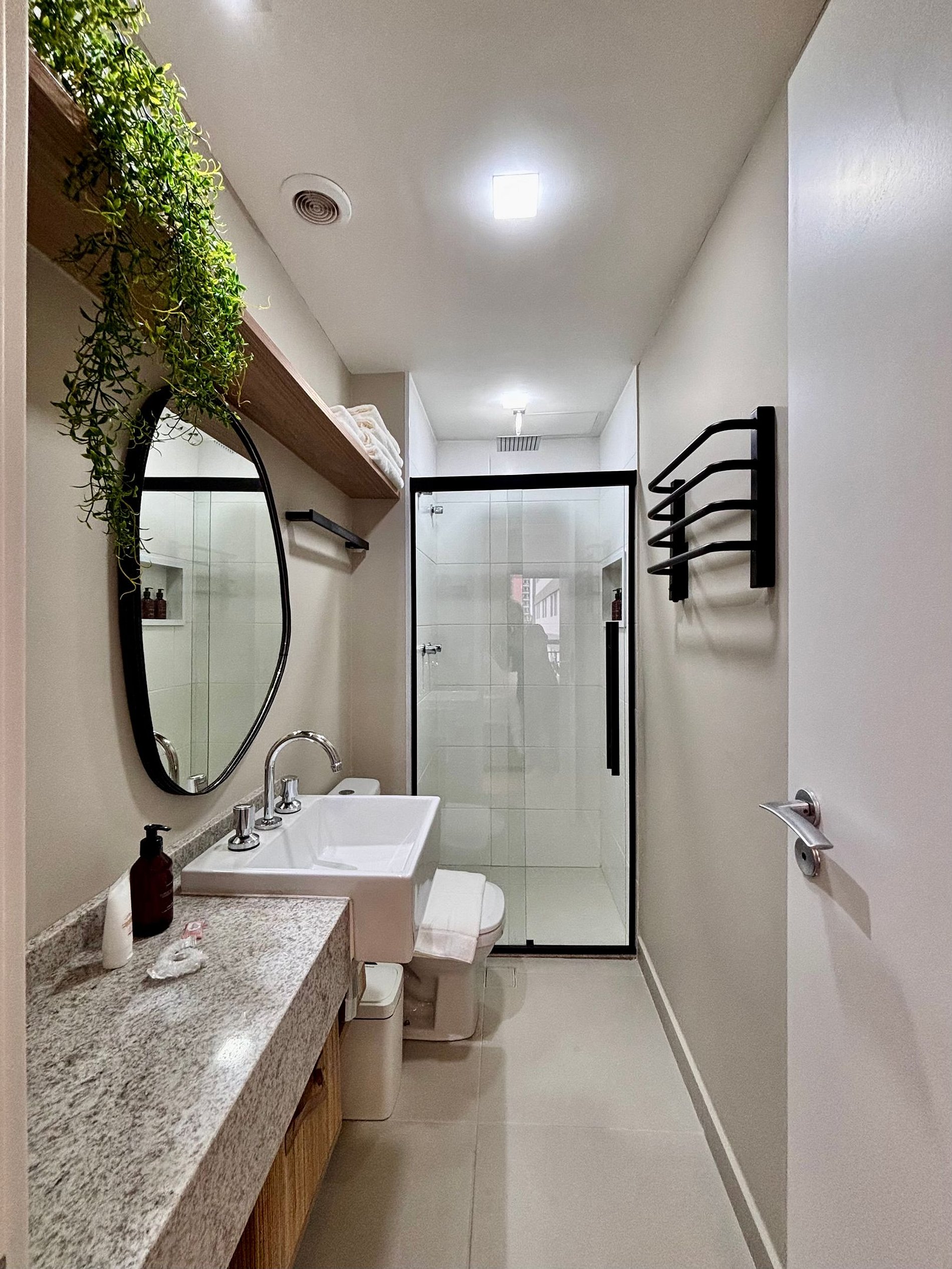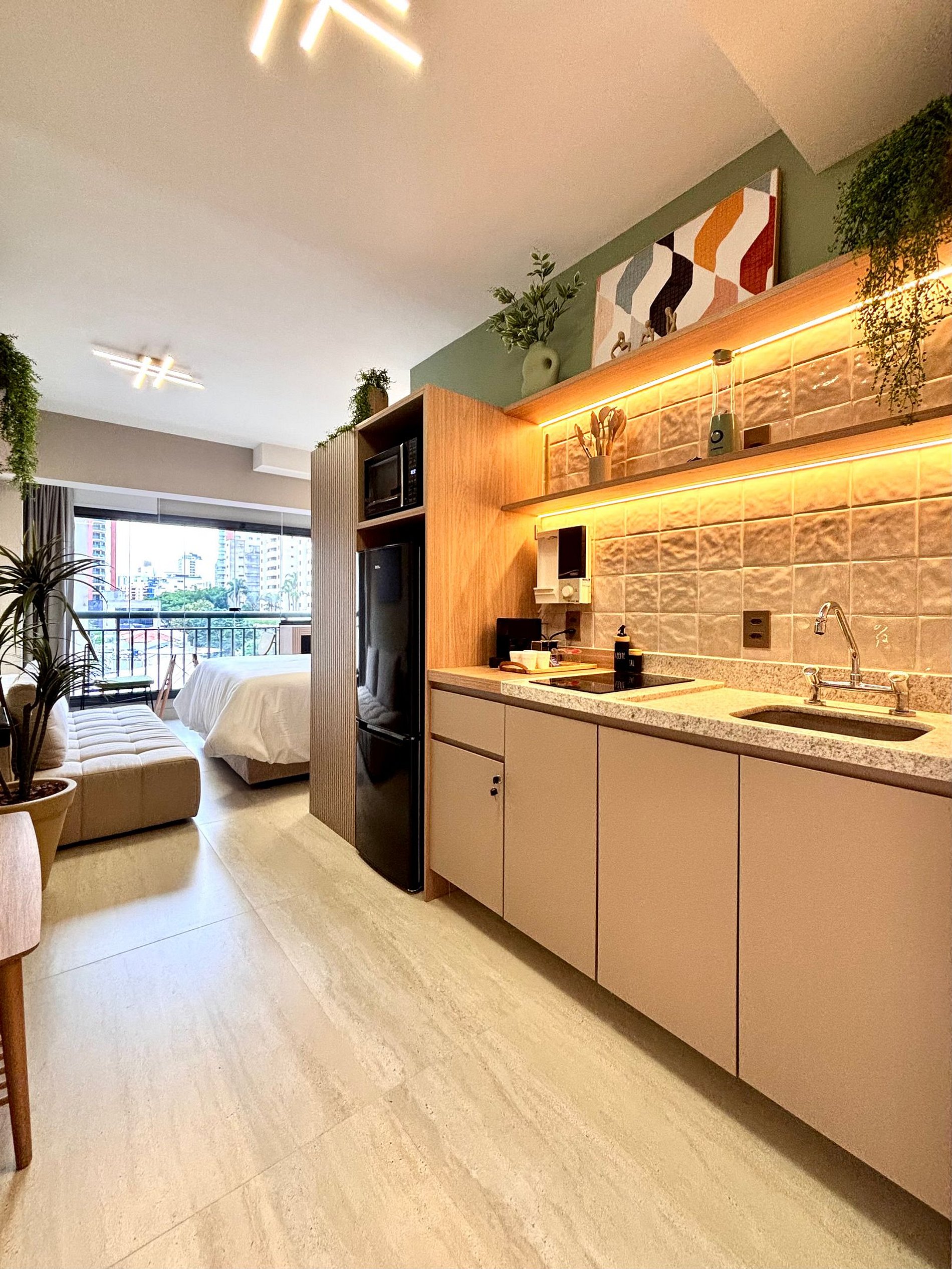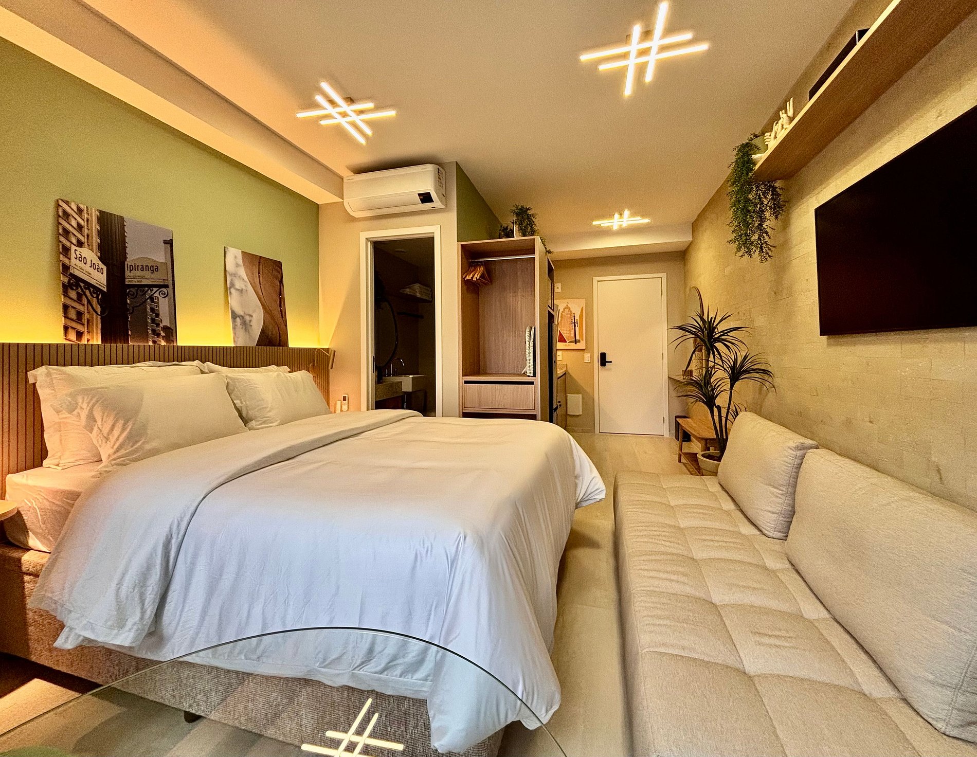 O espaço acomoda até 3 pessoas com conforto, contando com cama queen e sofá-cama, além de um layout bem distribuído que valoriza a amplitude e a iluminação natural. A decoração é atual e acolhedora e o ambiente funcional pensado para estadias curtas ou longas.