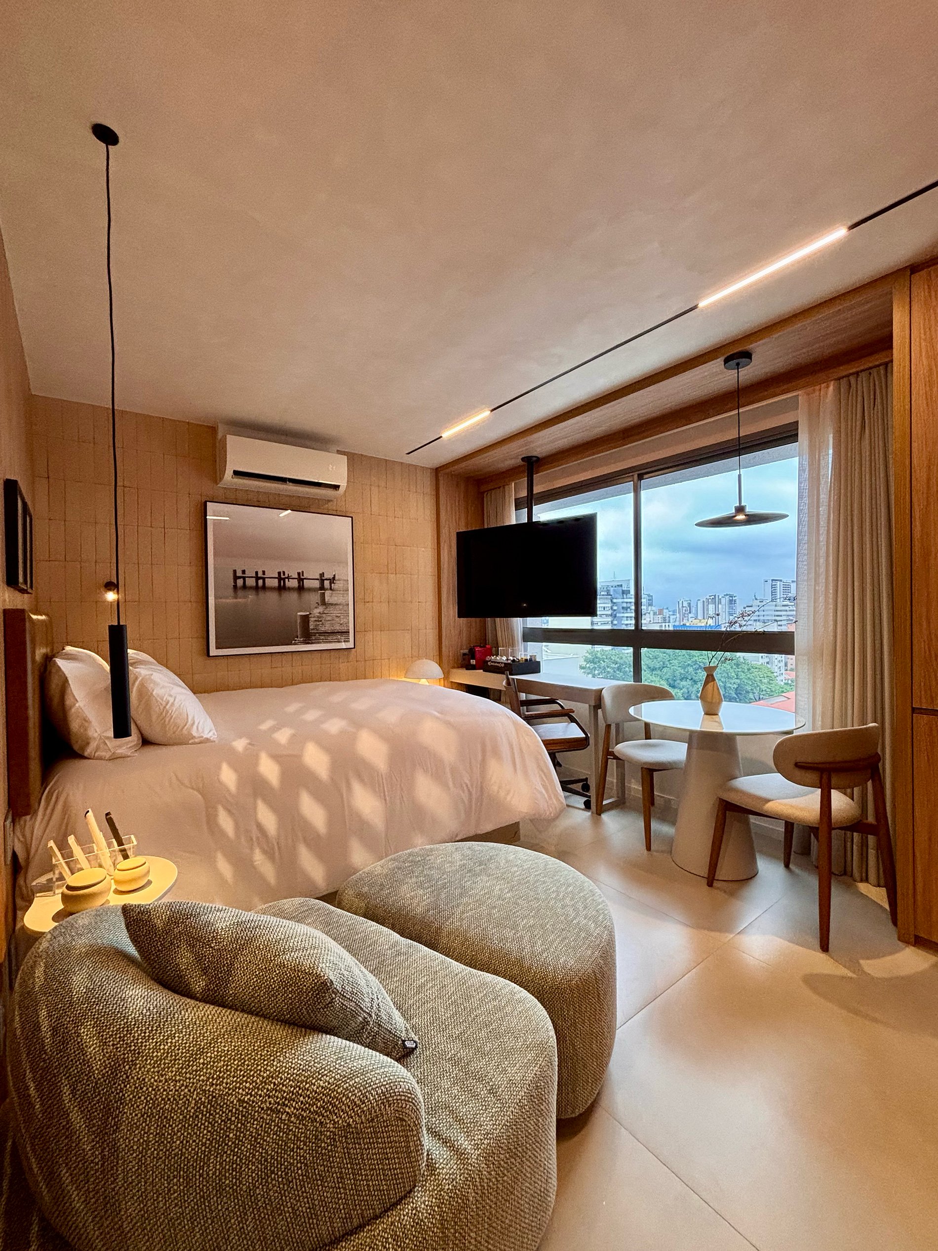 A disposição inteligente do ambiente permite circulação confortável, mantendo a praticidade para estadias curtas ou mais longas.