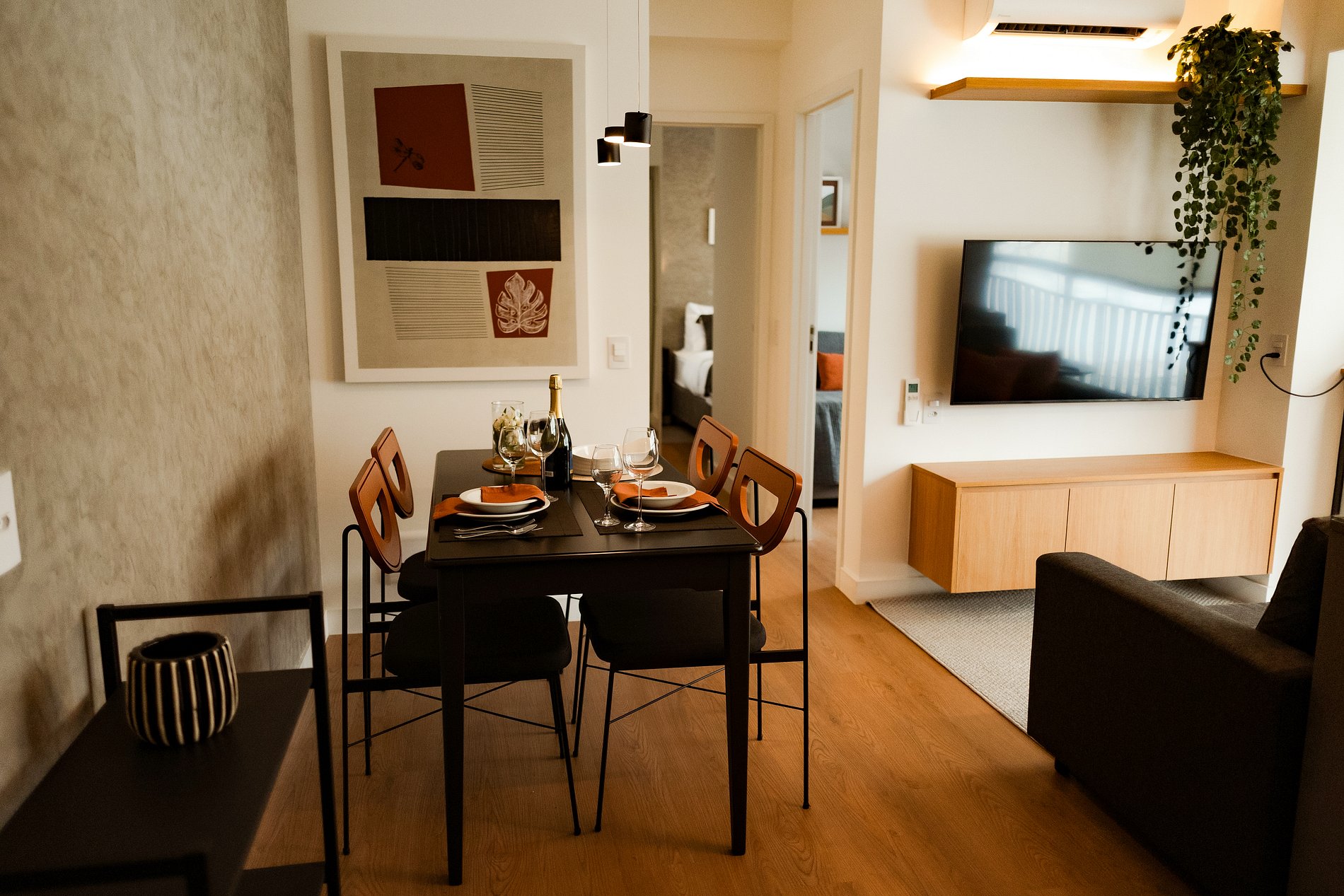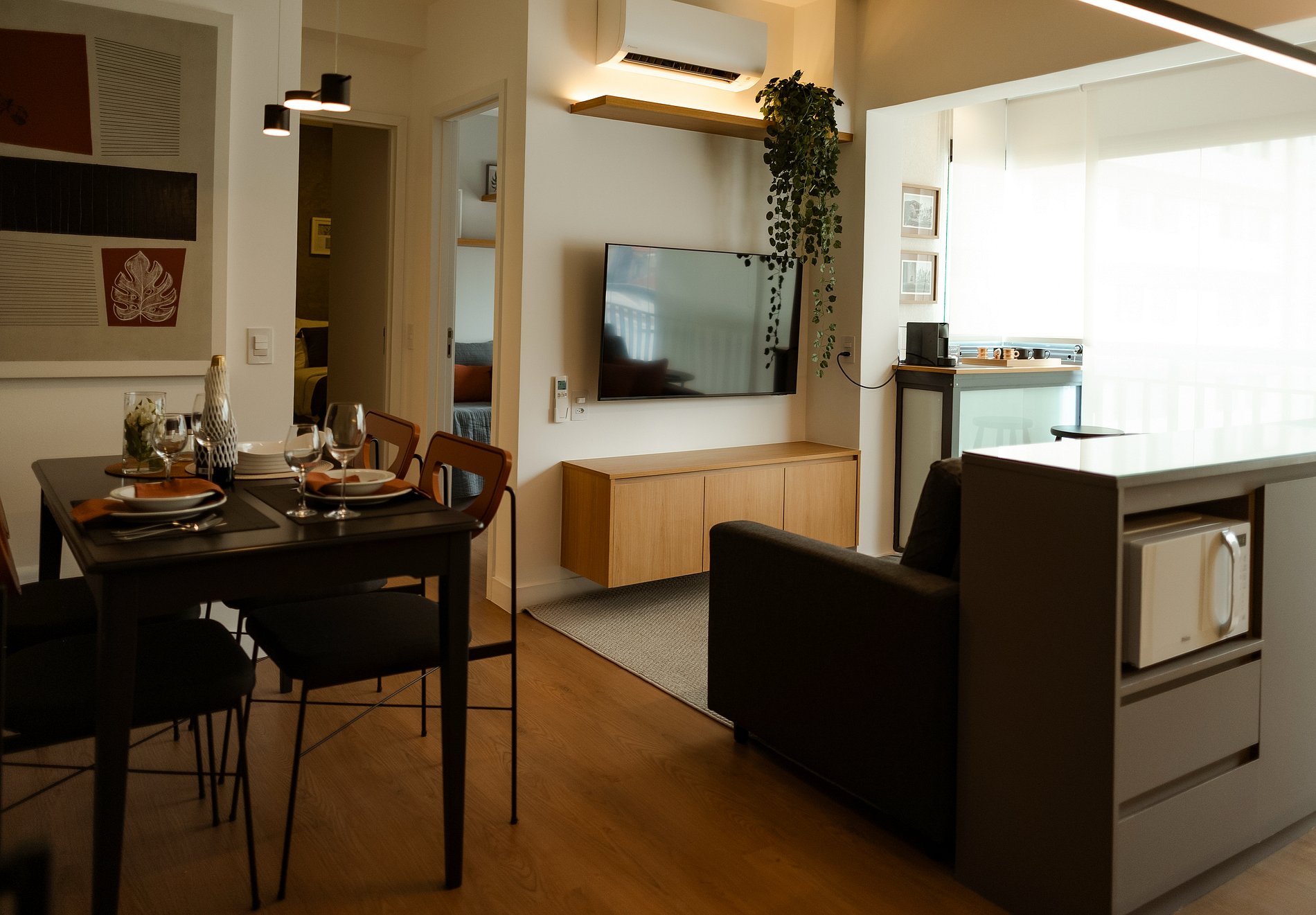 A disposição inteligente dos ambientes garante circulação fluida e praticidade, ideal tanto para estadias curtas quanto mais longas.