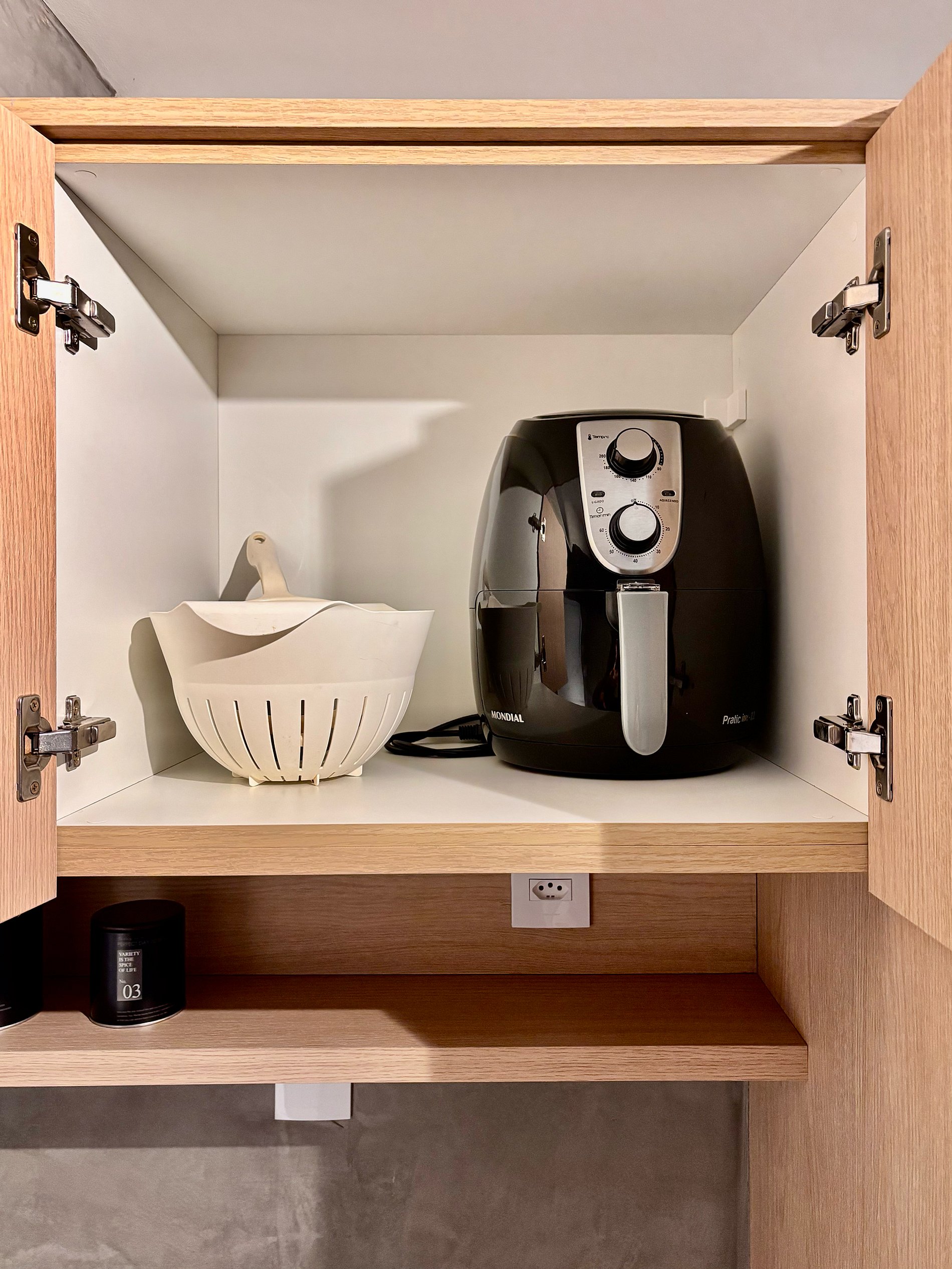 - Cafeteira Nespresso e cafeteira elétrica Electrolux, grelha, Fogão de Indução e Air Fryer: Inclui cápsulas de café, sachês de açúcar, além de um kit de panelas de indução e azeite, sal e pimenta para uma experiência culinária moderna e prática.