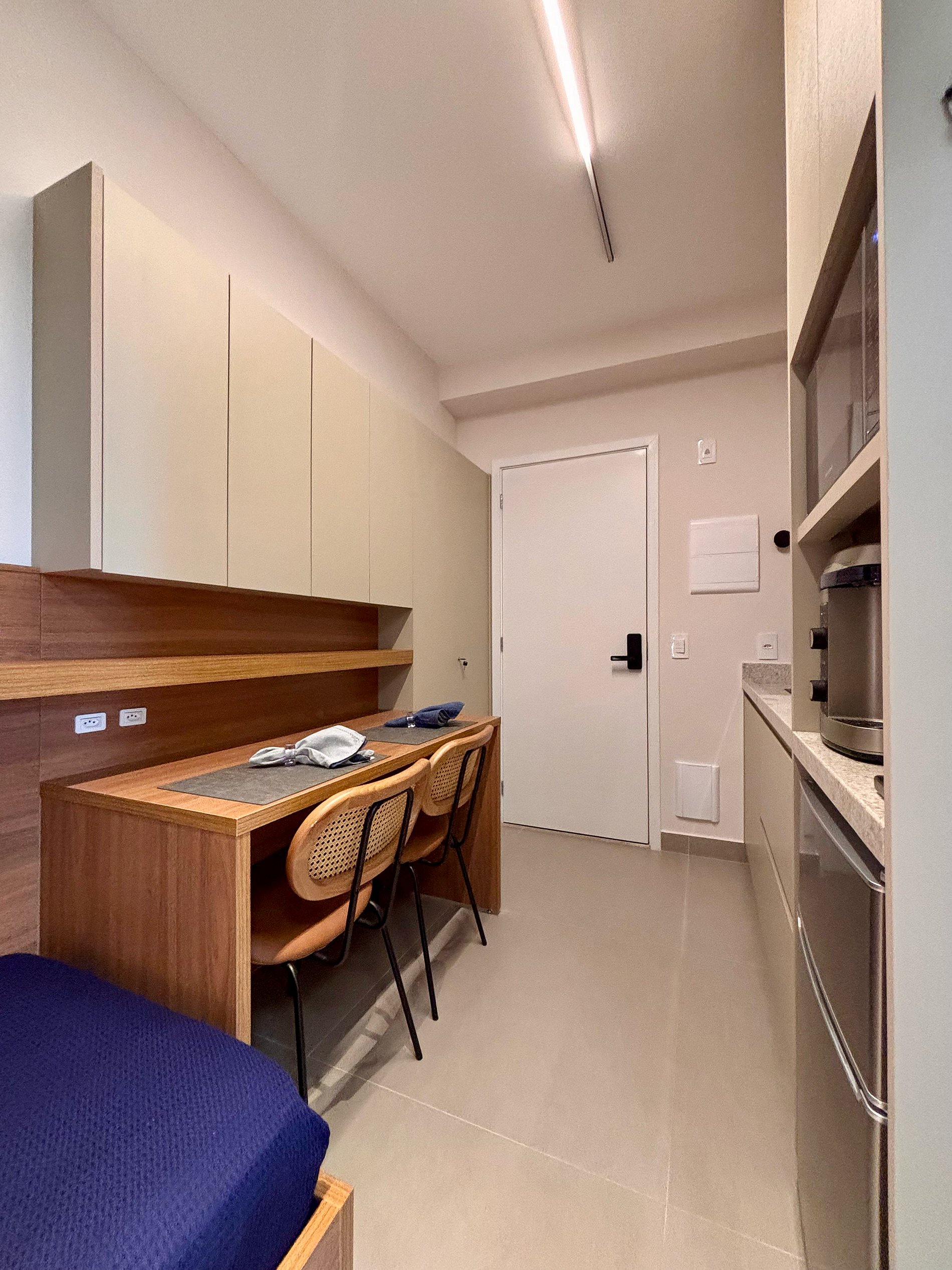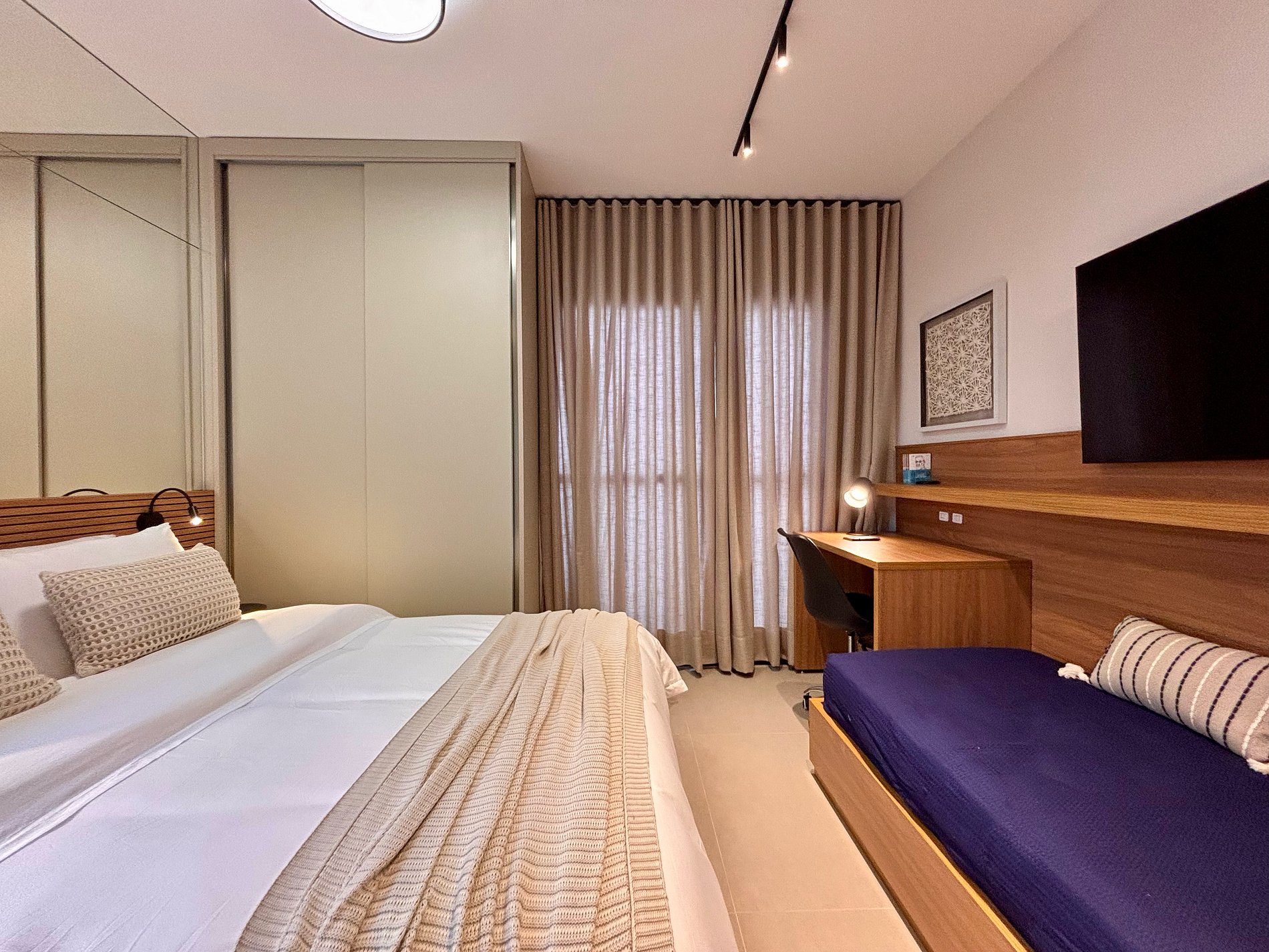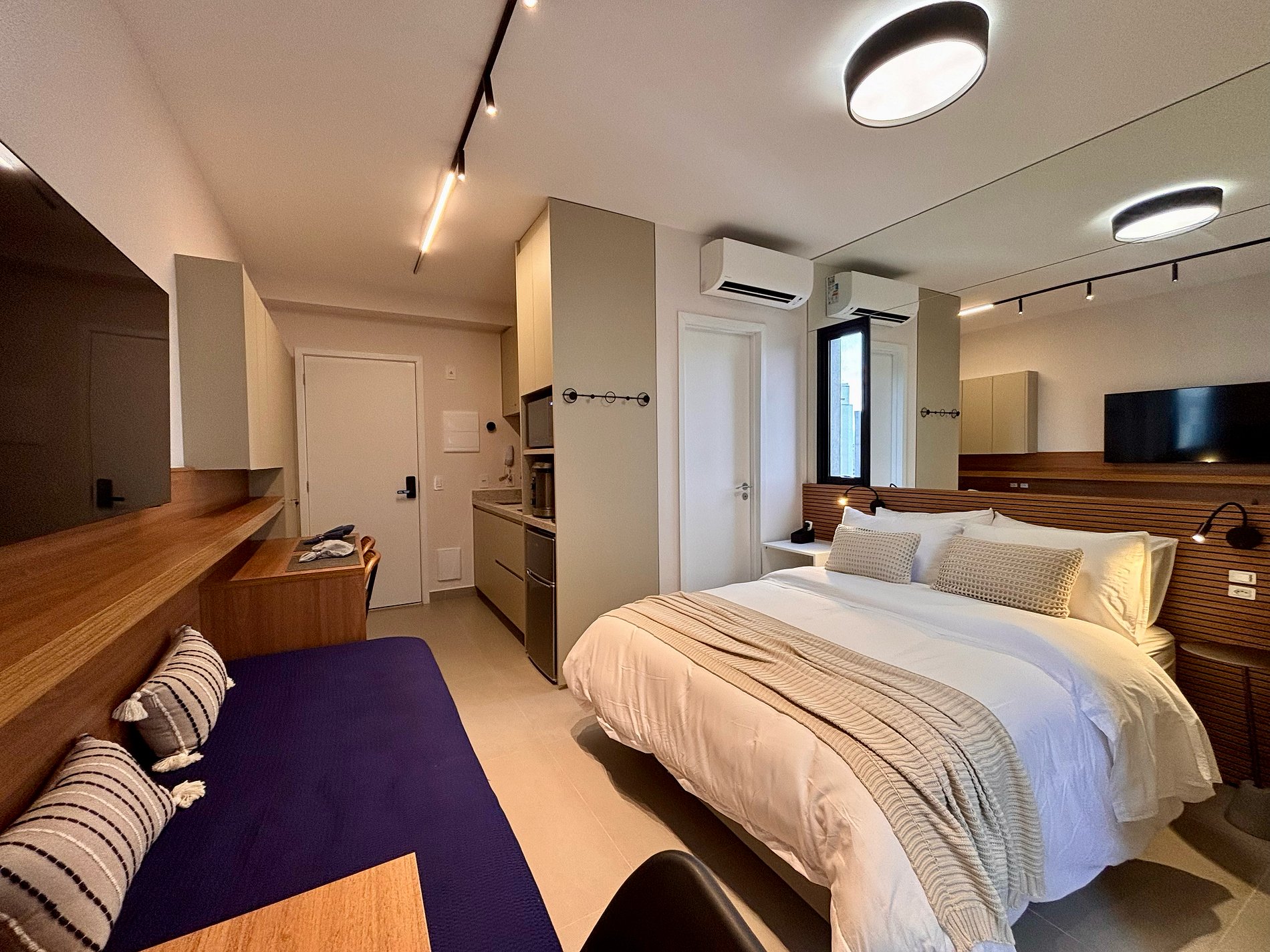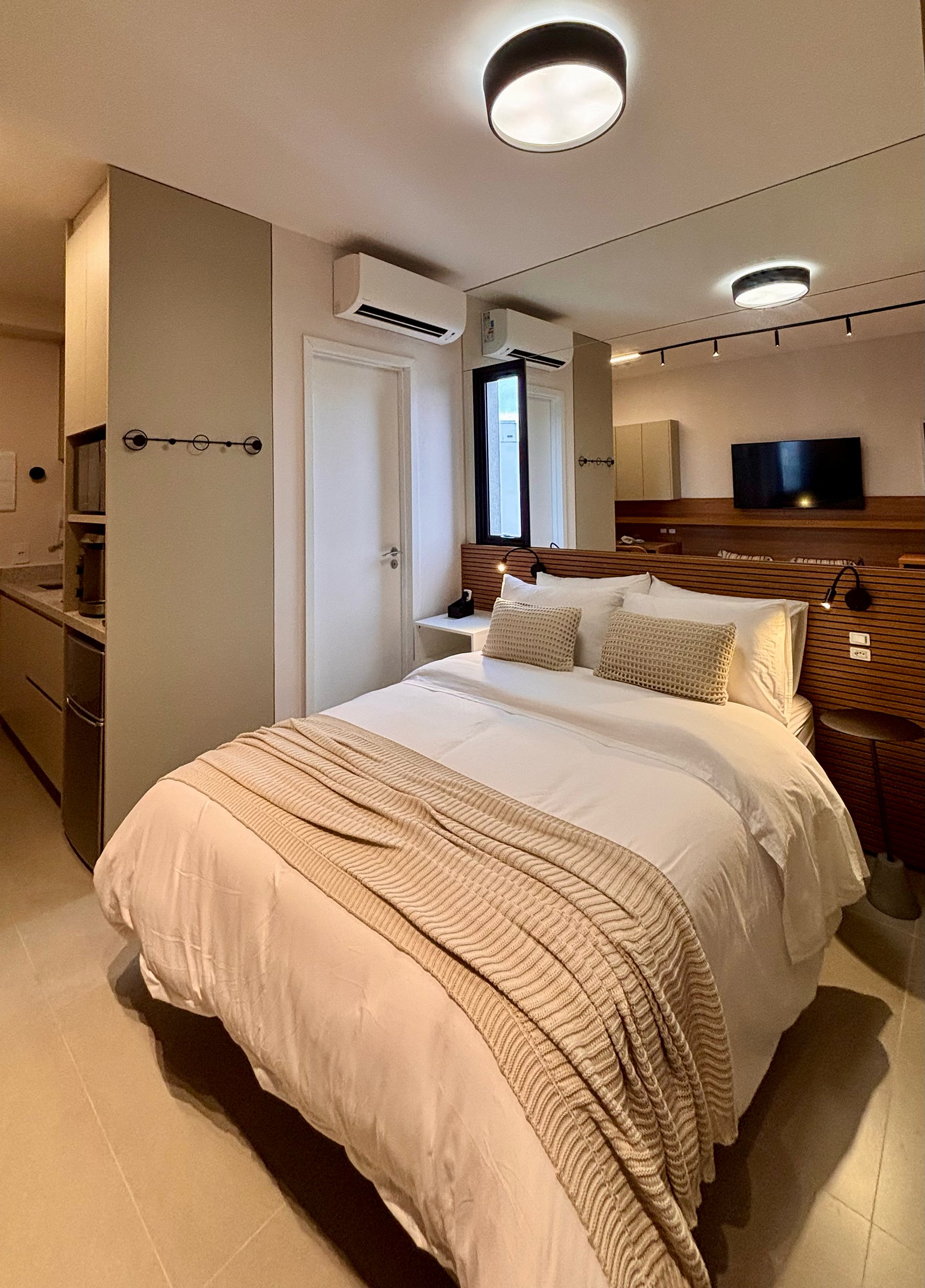 A disposição inteligente do ambiente permite circulação confortável, mantendo a praticidade para estadias curtas ou mais longas.