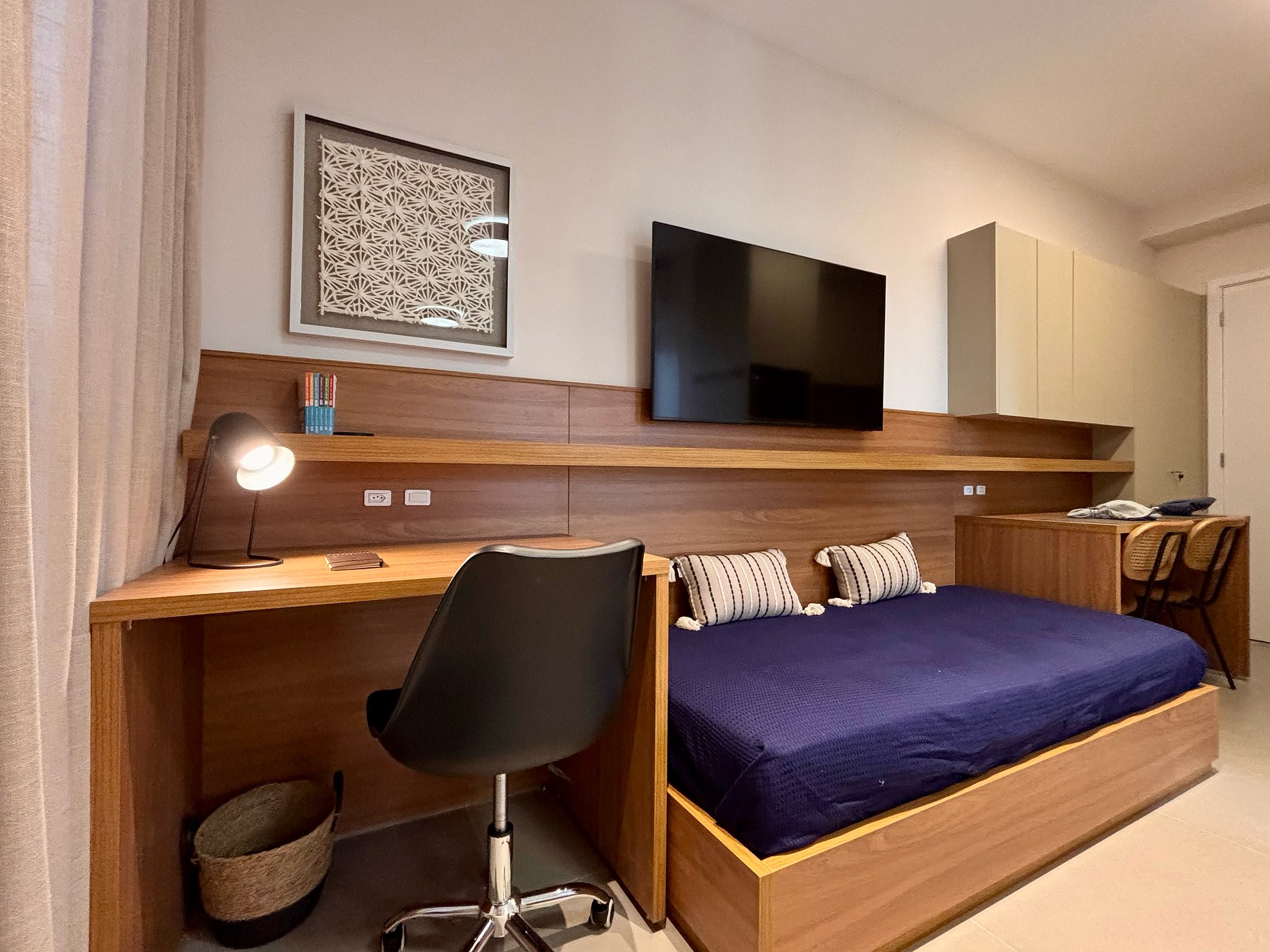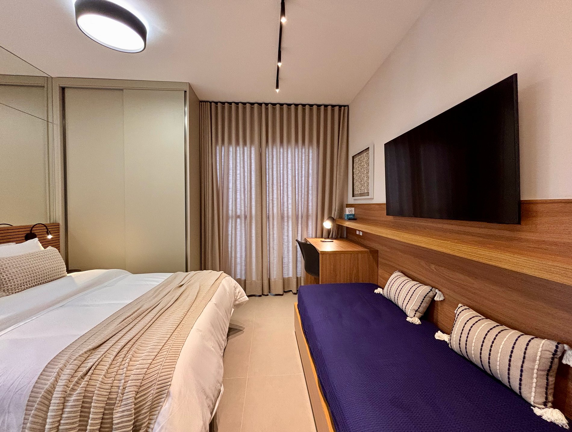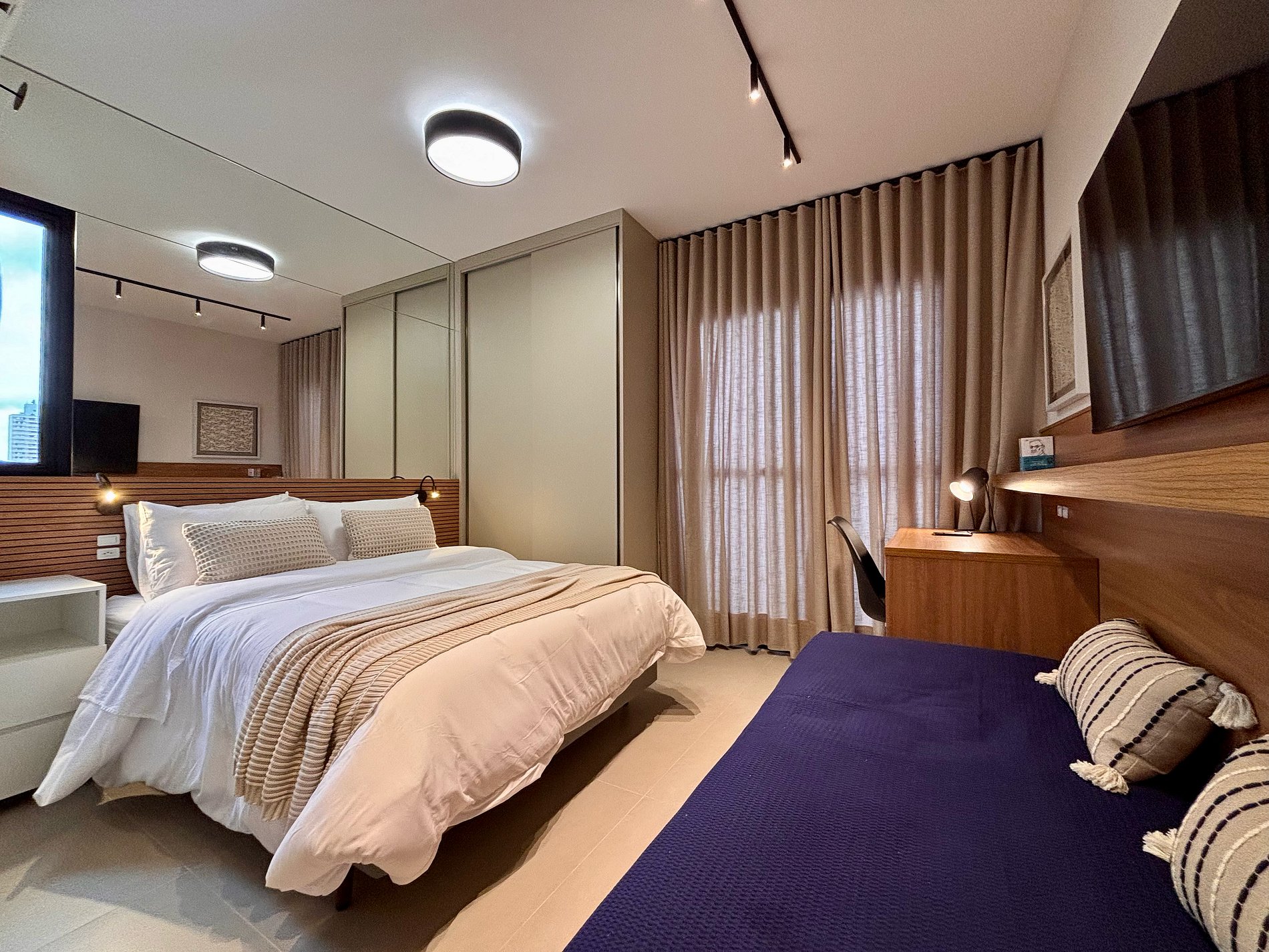 A disposição inteligente do ambiente permite circulação confortável, mantendo a praticidade para estadias curtas ou mais longas.