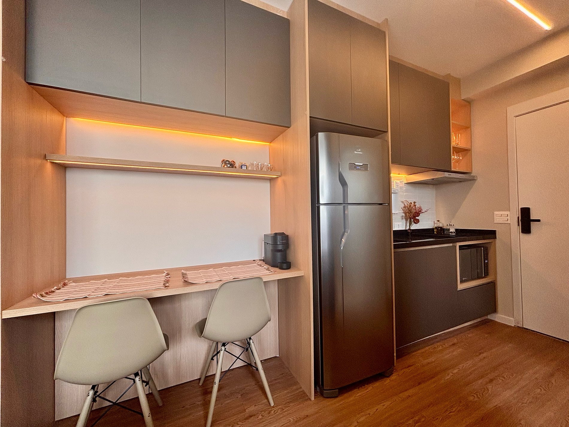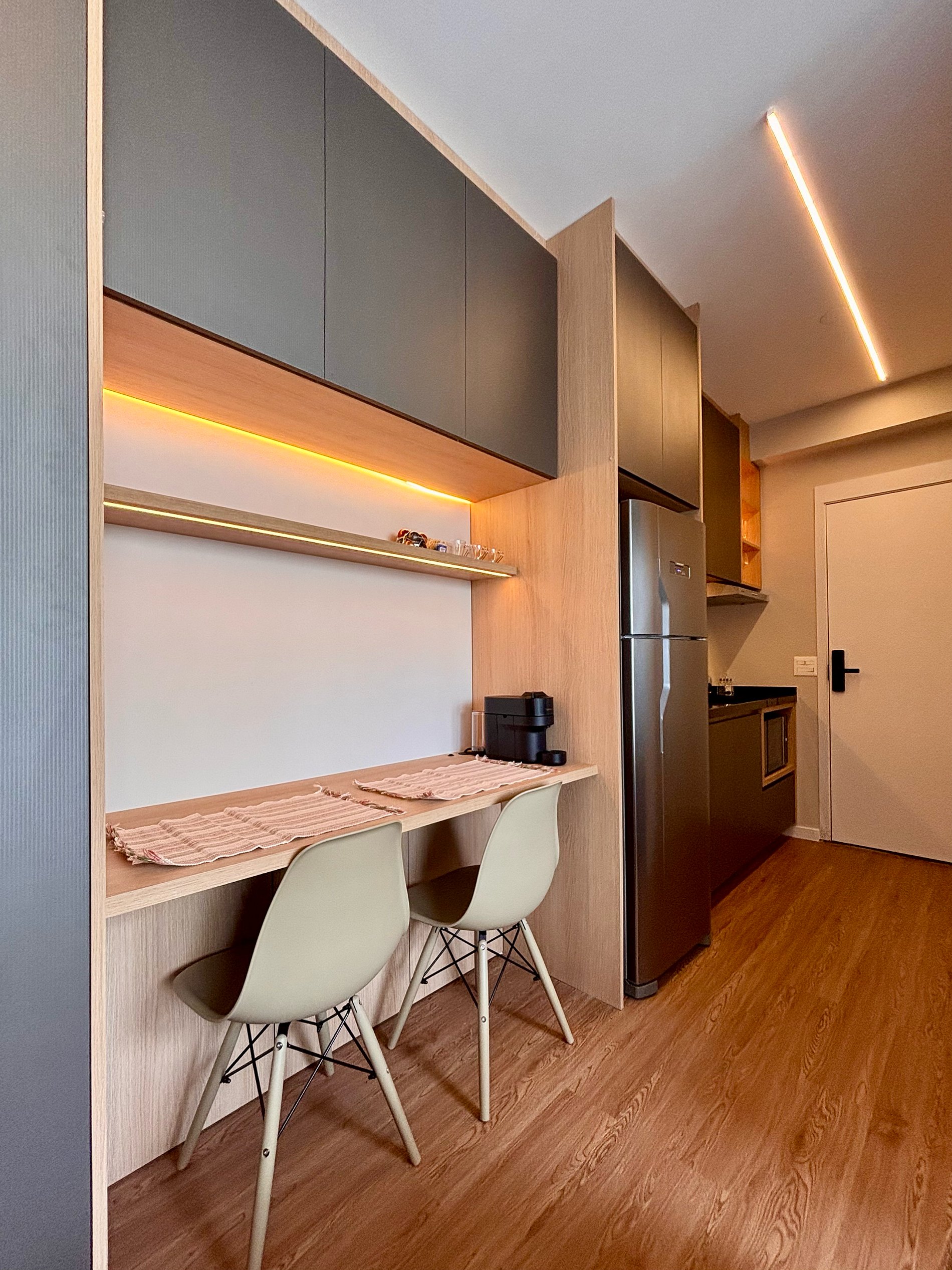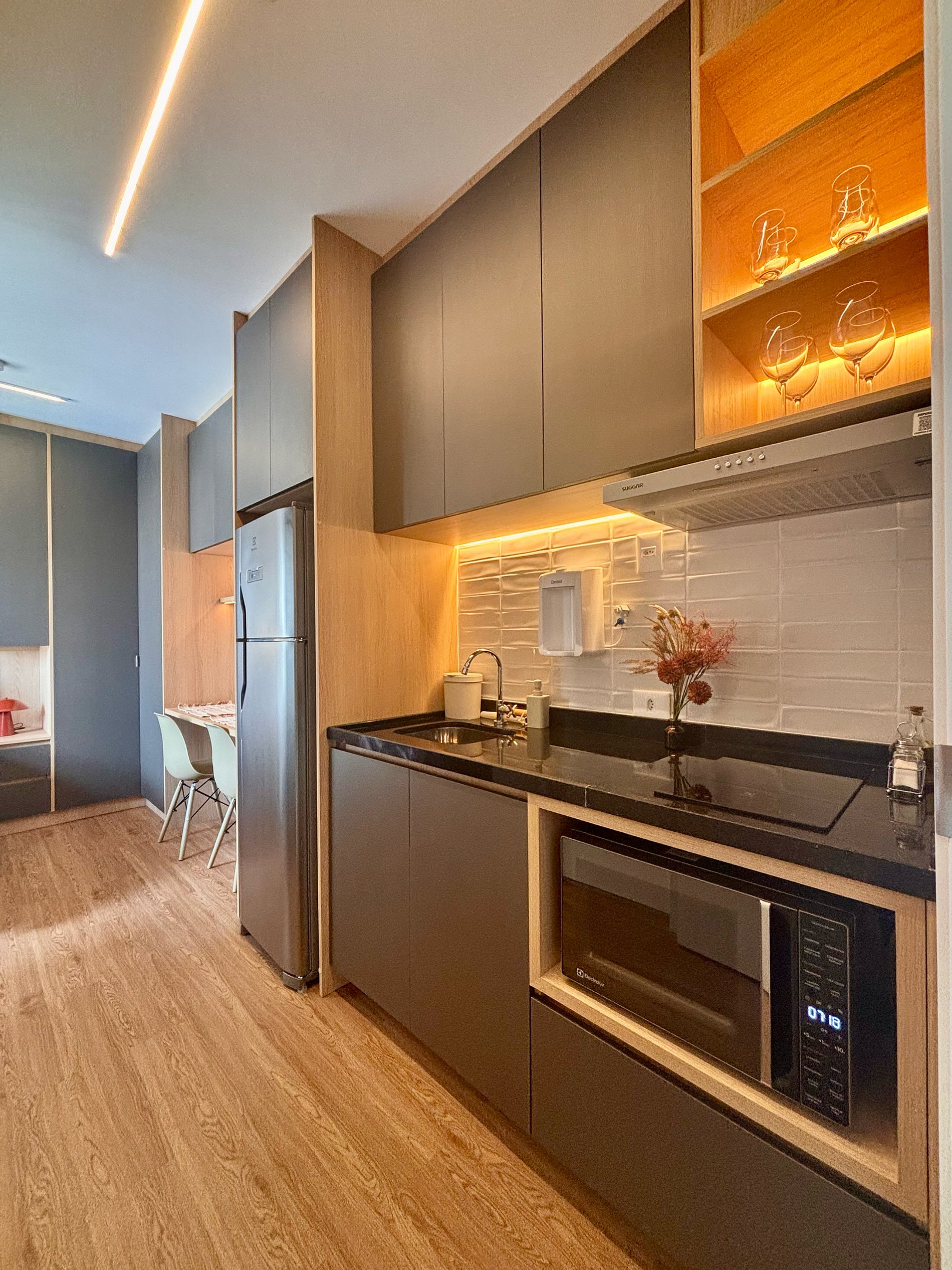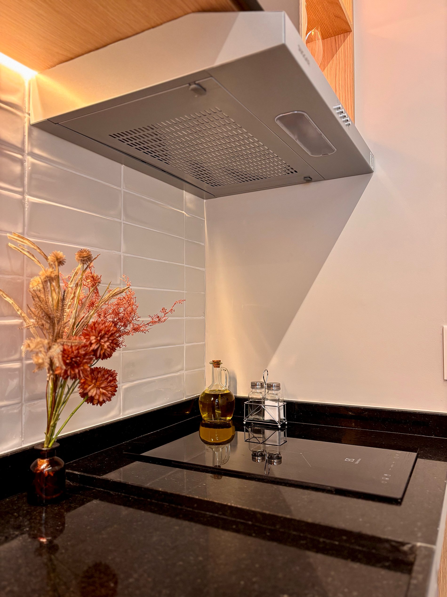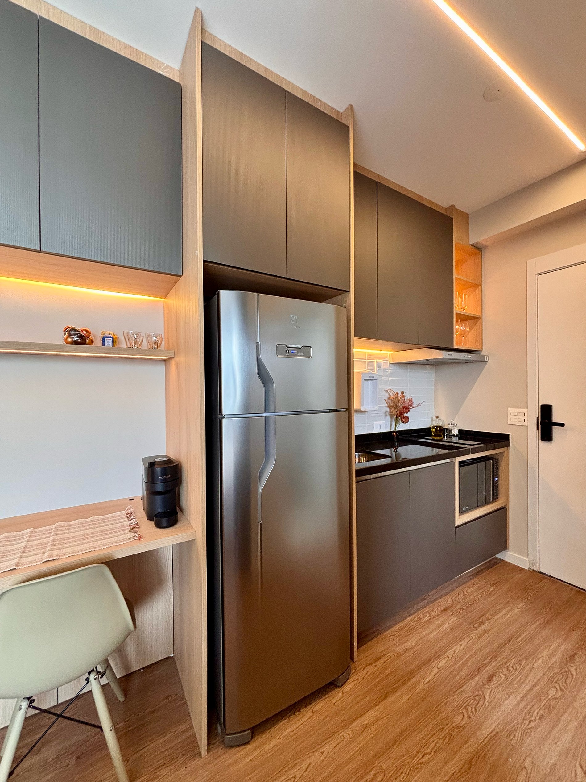 A cozinha é completa e pensada para o dia a dia: cafeteira Nespresso com cápsulas, filtro de água com opção gelada, cooktop por indução, micro-ondas, sanduicheira e kit completo de panelas. Tudo preparado para oferecer autonomia e praticidade.Smart TV com acesso a plataformas de streaming, ferro e tábua de passar, secador de cabelo e amenities selecionados complementam a experiência.