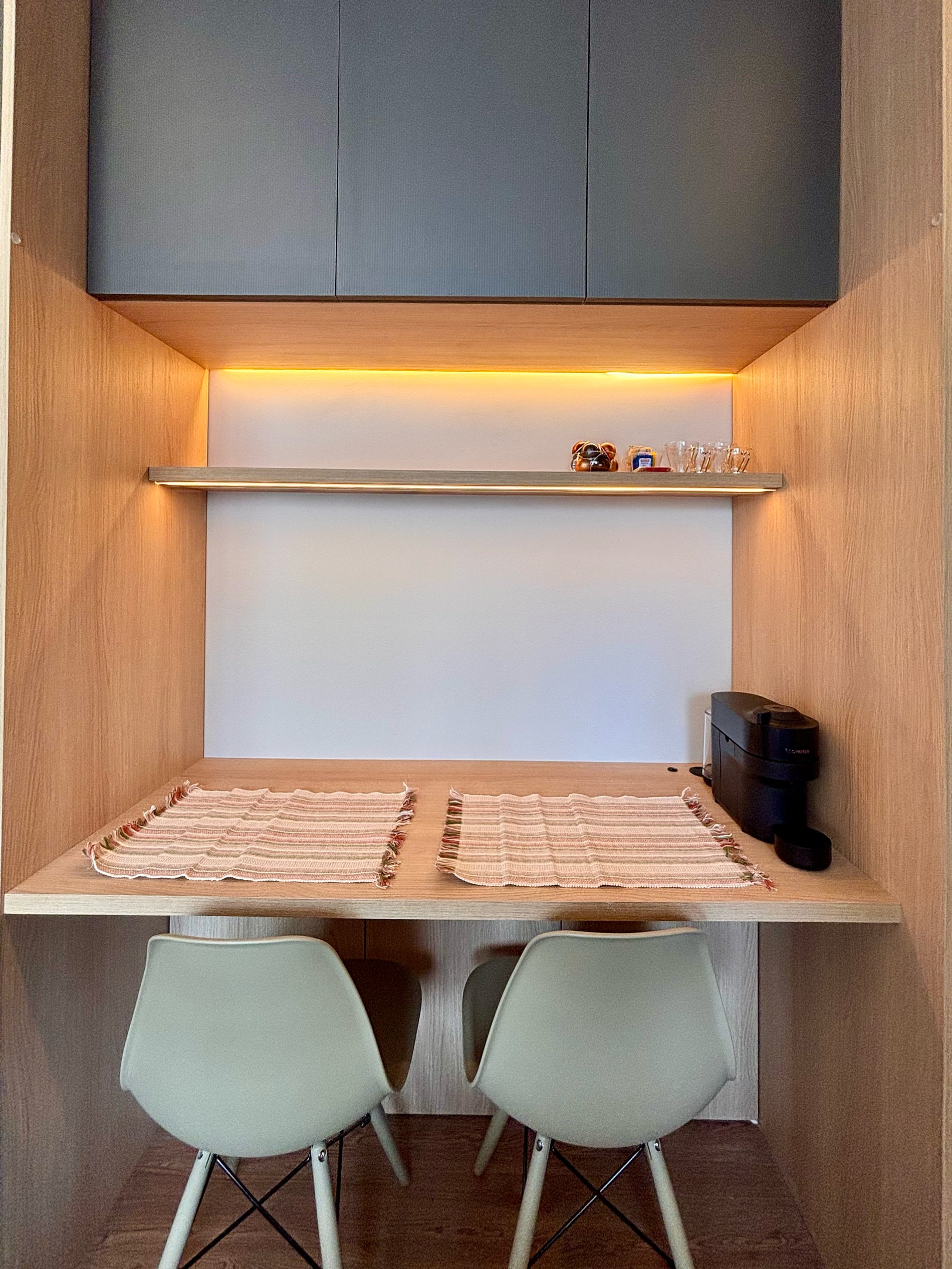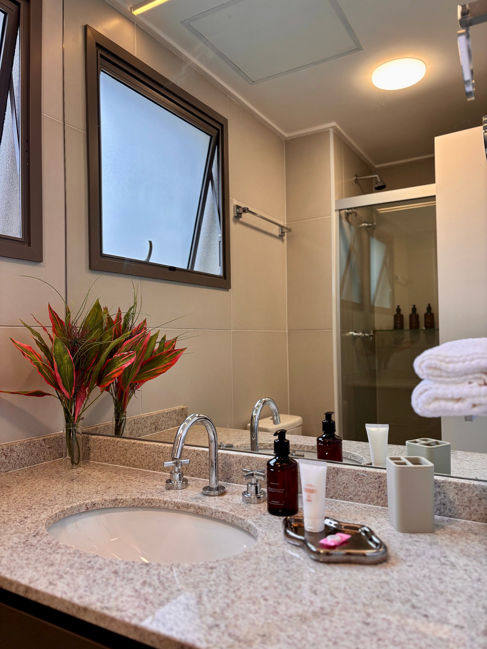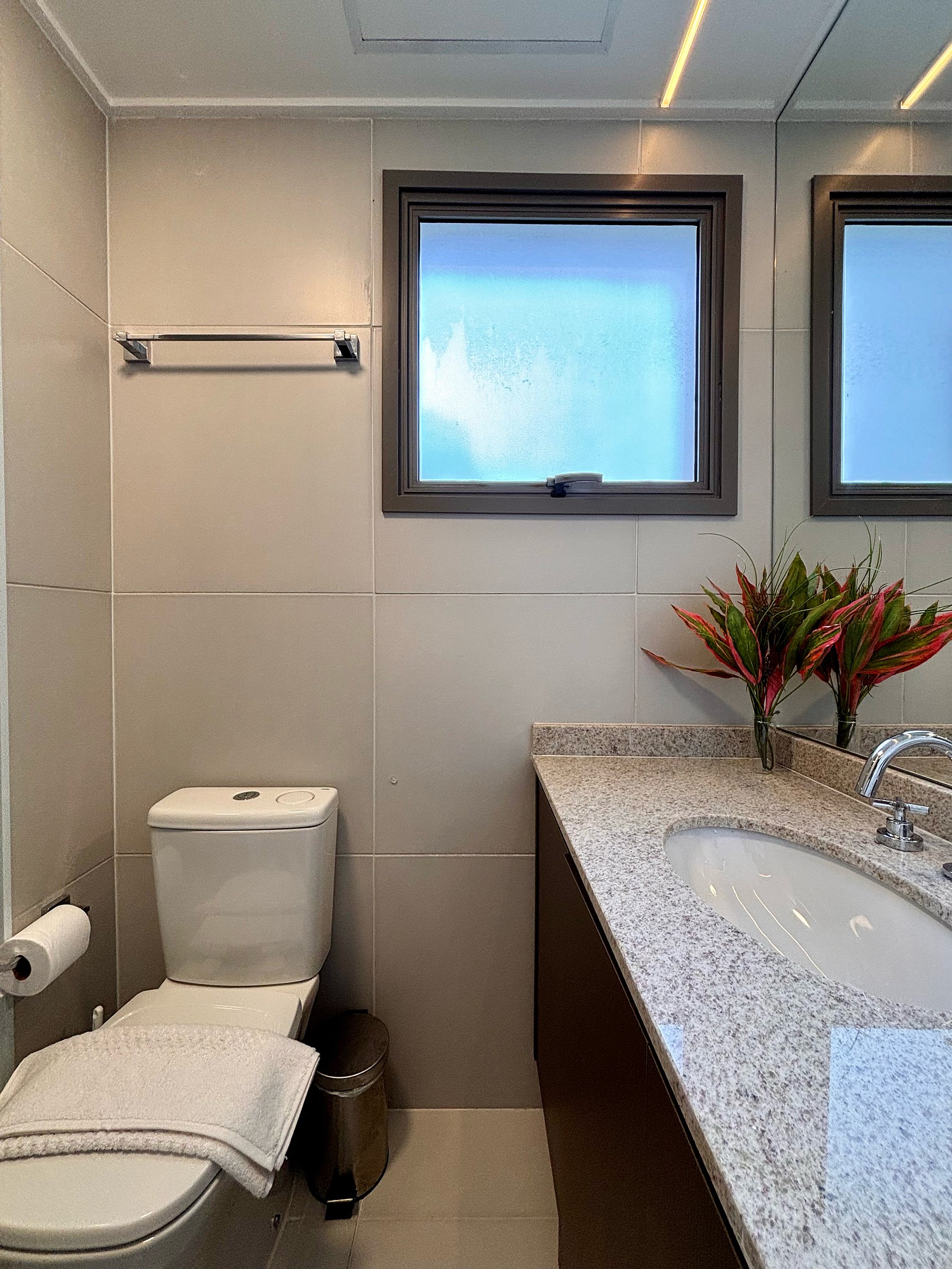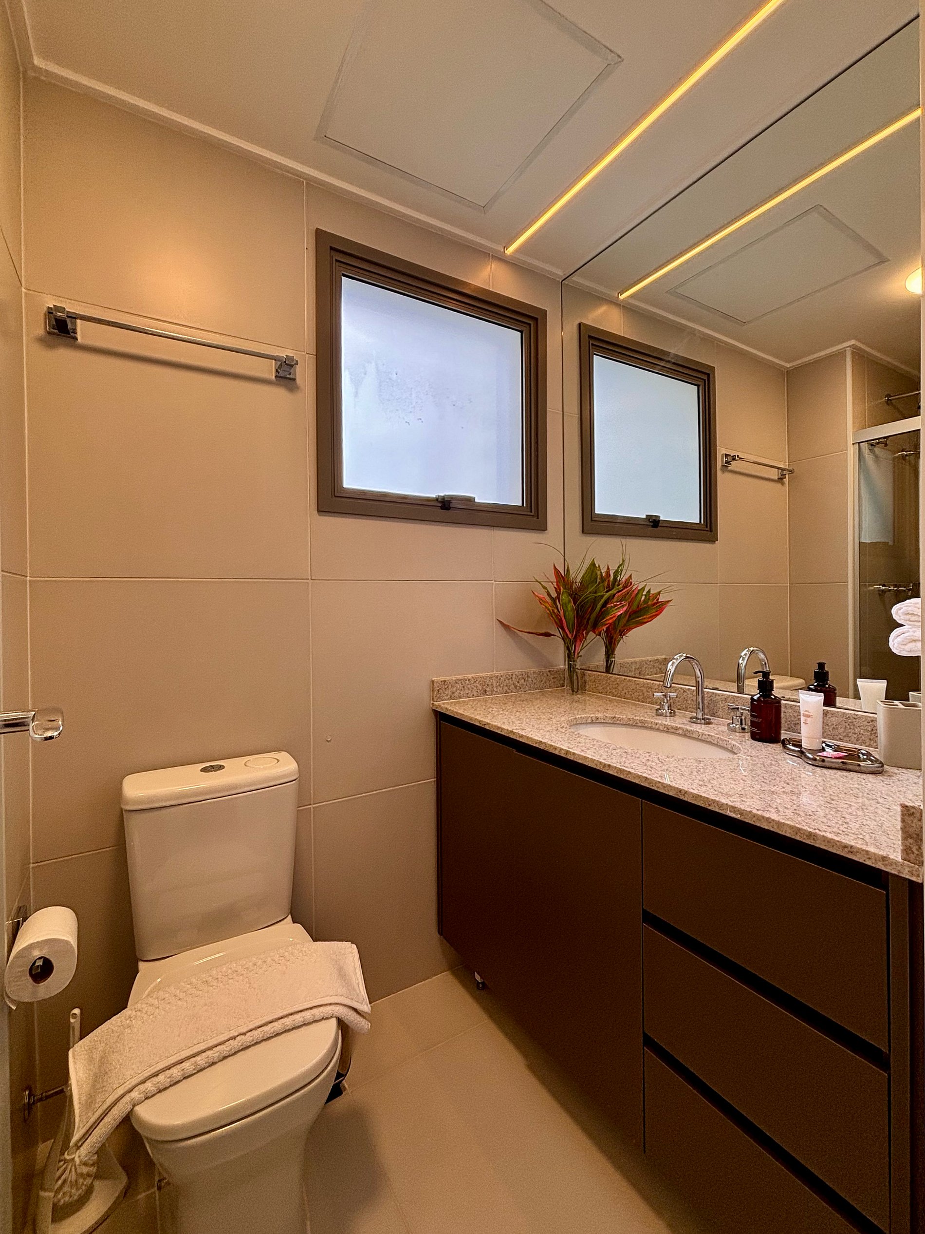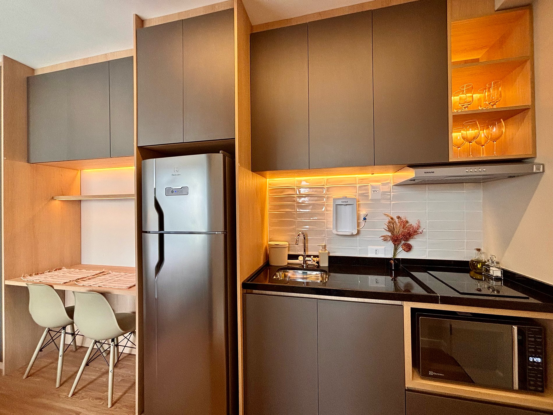 A cozinha é completa e pensada para o dia a dia: cafeteira Nespresso com cápsulas, filtro de água com opção gelada, cooktop por indução, micro-ondas, sanduicheira e kit completo de panelas. Tudo preparado para oferecer autonomia e praticidade.Smart TV com acesso a plataformas de streaming, ferro e tábua de passar, secador de cabelo e amenities selecionados complementam a experiência.