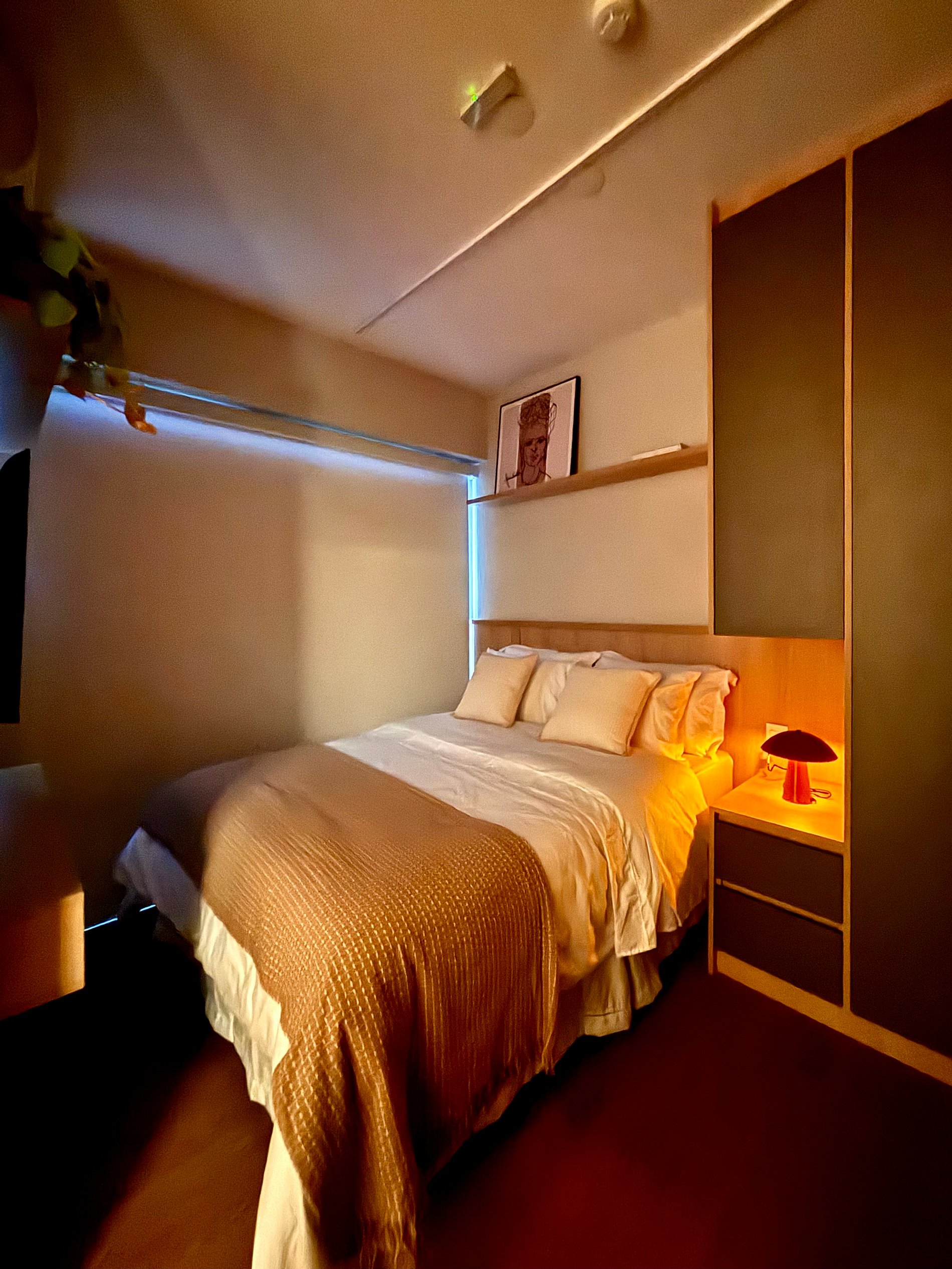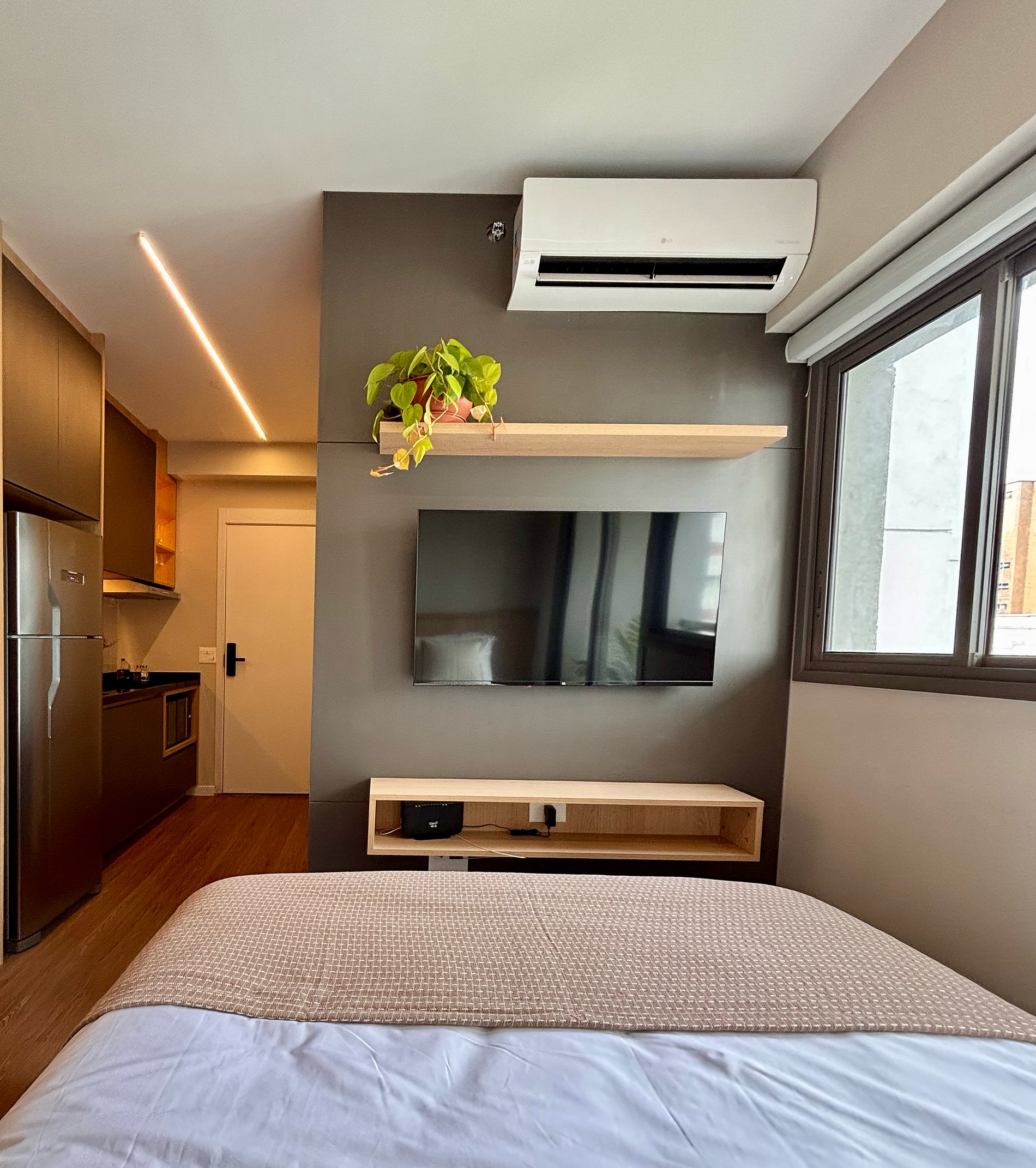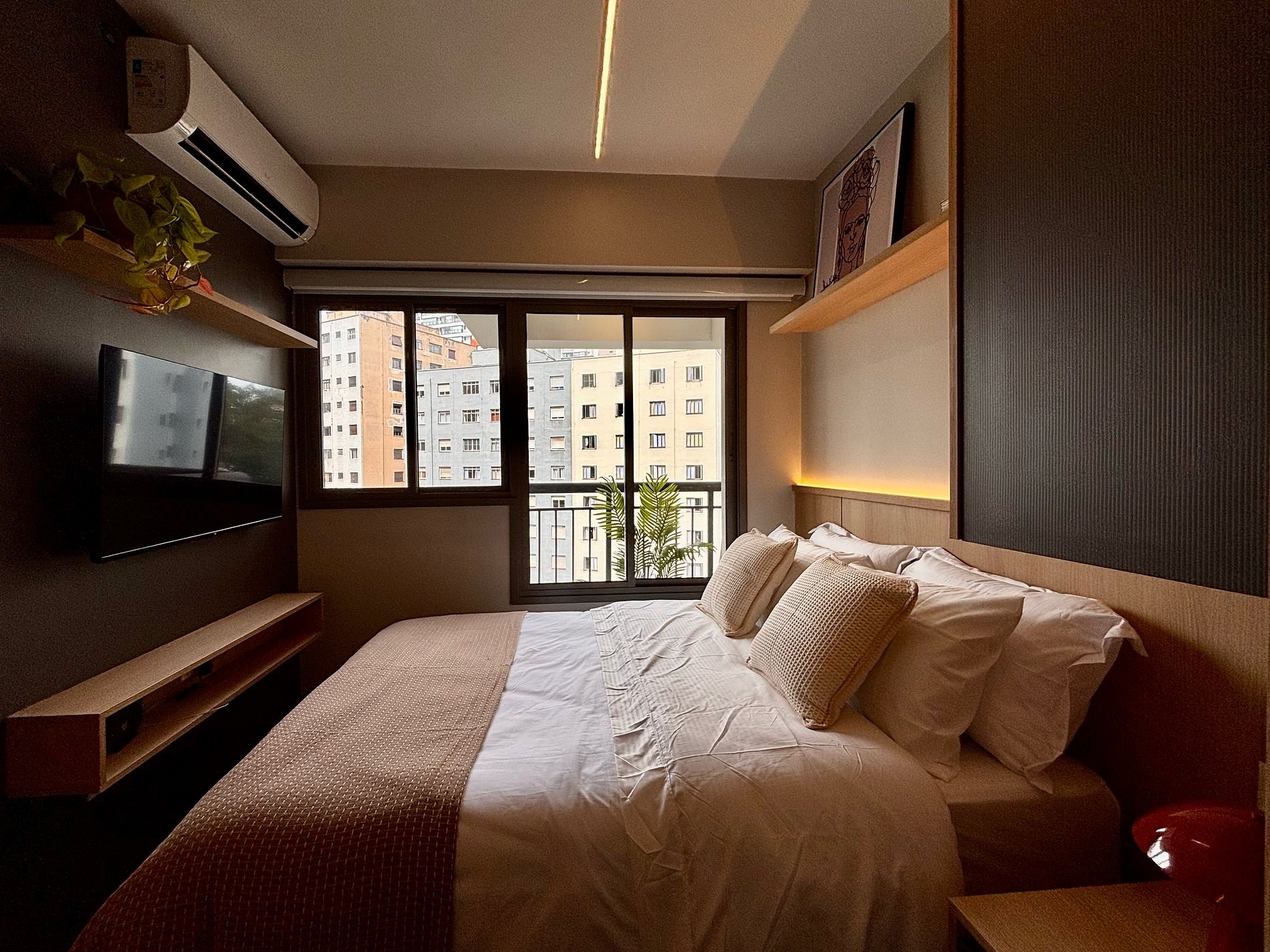 A cama de casal conta com enxoval 100% algodão e toalhas de alta qualidade, garantindo padrão superior de conforto. O ambiente é climatizado com ar-condicionado e equipado com Wi-Fi rápido e estável, ideal para trabalho remoto, estudos ou compromissos profissionais.