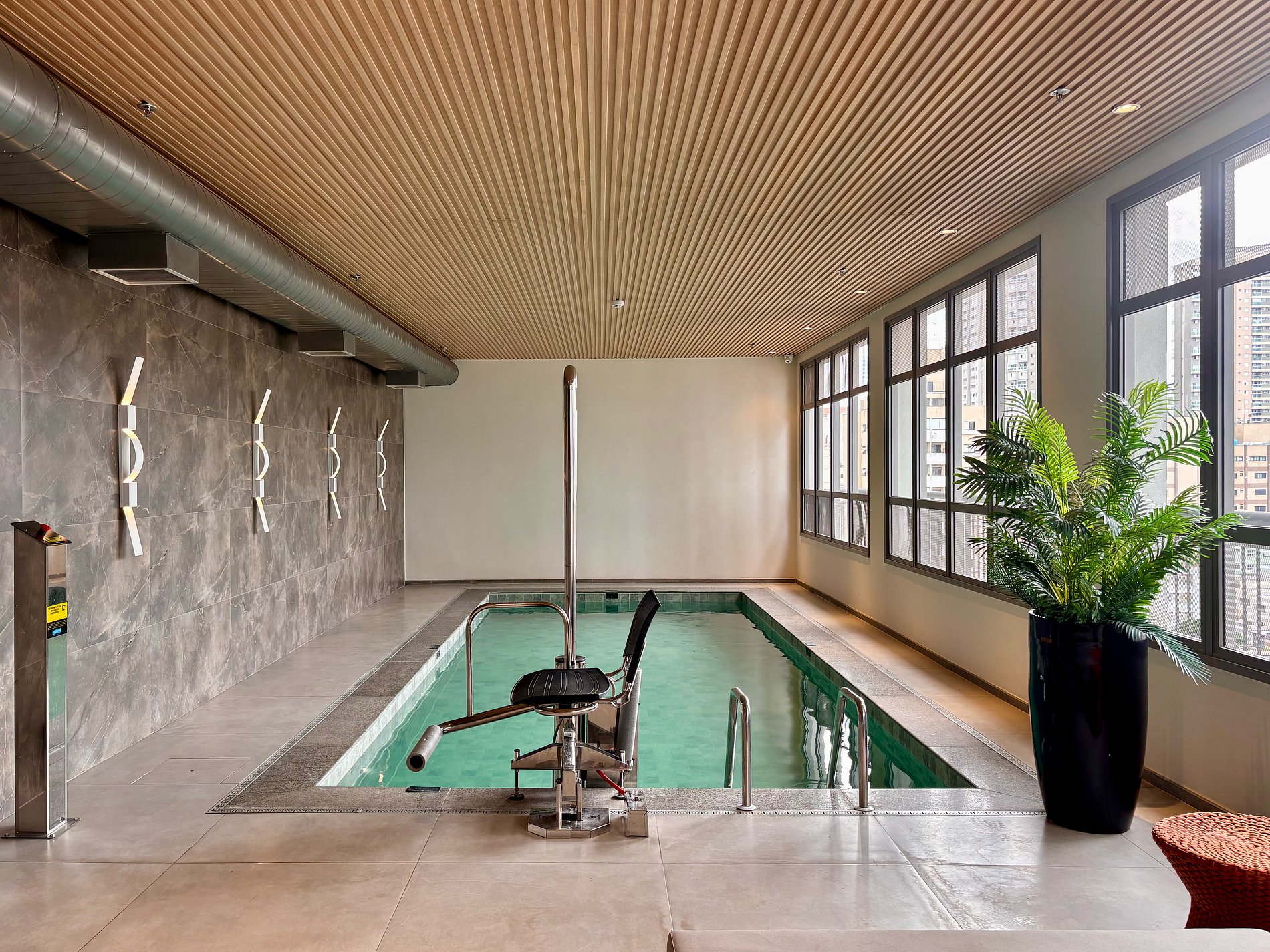 Condomínio com academia, piscina coberta, sauna, coworking e segurança 24h.